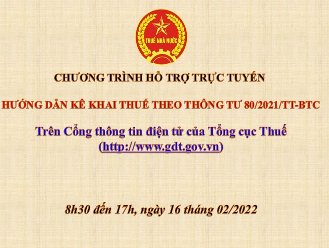 Sáng ngày 16/02/2022, Tổng cục Thuế sẽ tổ chức chương trình hỗ trợ trực tuyến: Hướng dẫn kê khai thuế theo quy định tại Thông tư 80/2021/TT-BTC trên Cổng thông tin điện tử Tổng cục Thuế.